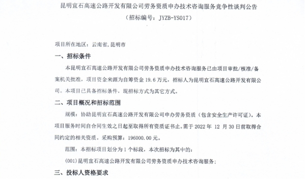 昆明宜石高速公路开发有限公司劳务资质申办技术咨询服务竞争性谈判公告