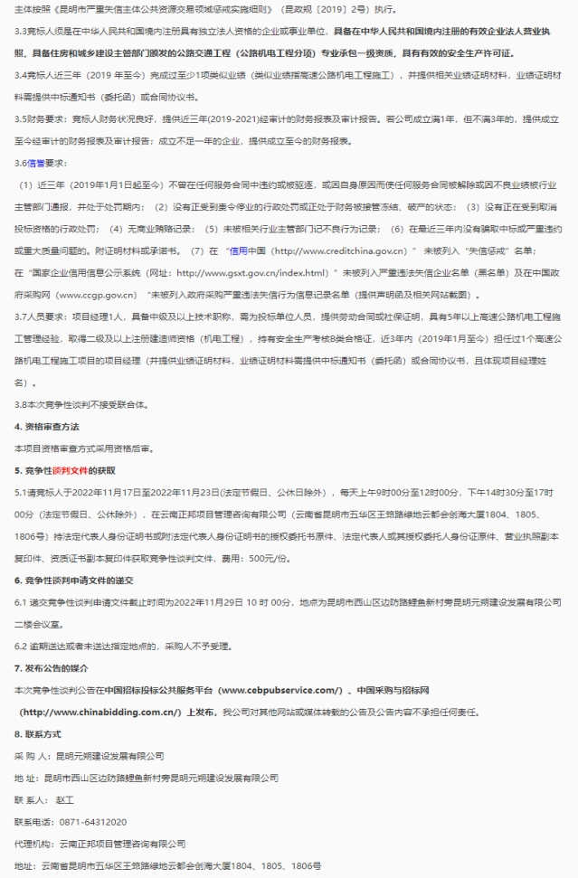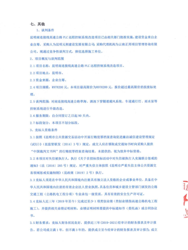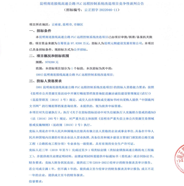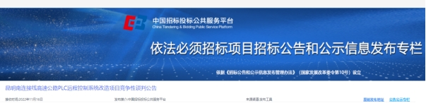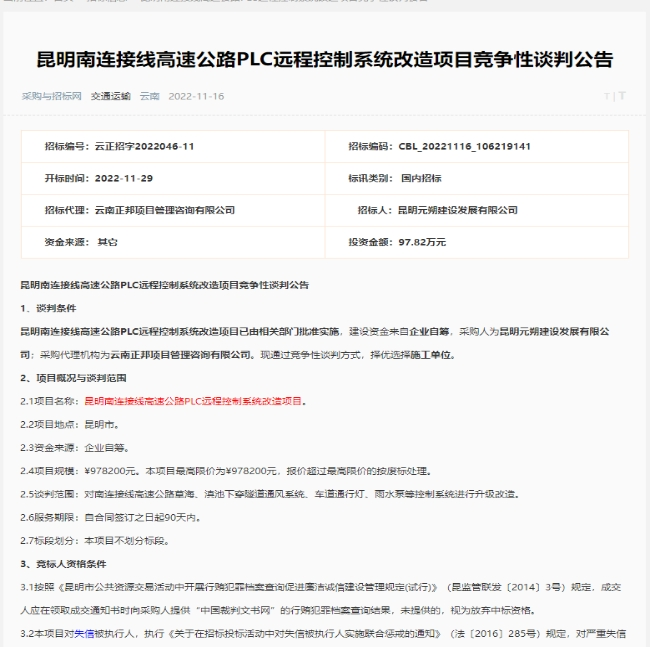 昆明南连接线高速公路PLC远程控制系统改造项目竞争性谈判公告
