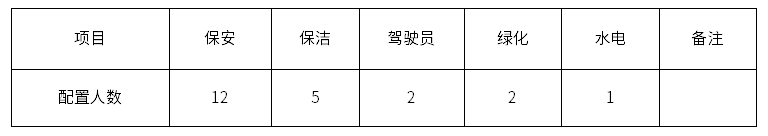 保安人员计划配置12人,其中阿着底管理中心 4人、圭山管理用房 2人、糯斗隧管所3人、圭山隧管所3人;驾驶员计划配置2人;保洁人员计划配置5人,其中罗衙办公点1人、阿着底管理中心3人、圭山管理用房1人;绿化人员计划配置2人,其中阿着底管理中心1人、圭山管理用房1人;水电工计划配置1人;以上人员具体工种及人数均以甲方实际要求为准,部分工种可根据实际提供倒班宿舍,在石泸公司食堂用餐需付费,餐费标准参照石泸公司的相关标准执行。