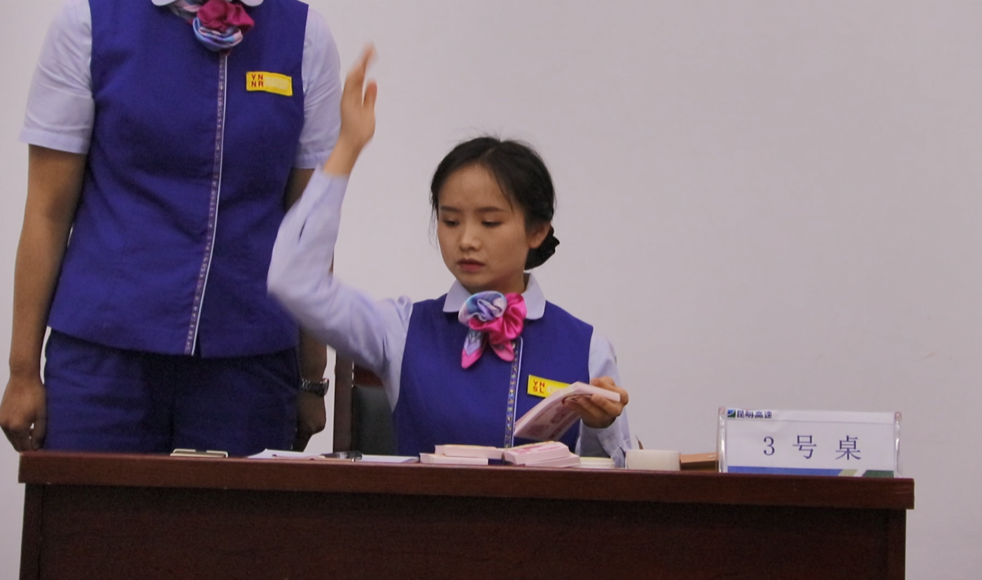 “刷刷刷”声此起彼伏,参赛选手动作飞快,用快、准、巧的点钞技艺完成拆把、点钞、扎把、记录等动作,选手们沉着应对、自信发挥,一张张点钞券在选手们灵巧的手指间滑过,翻打有序、姿态优雅、紧张激烈。