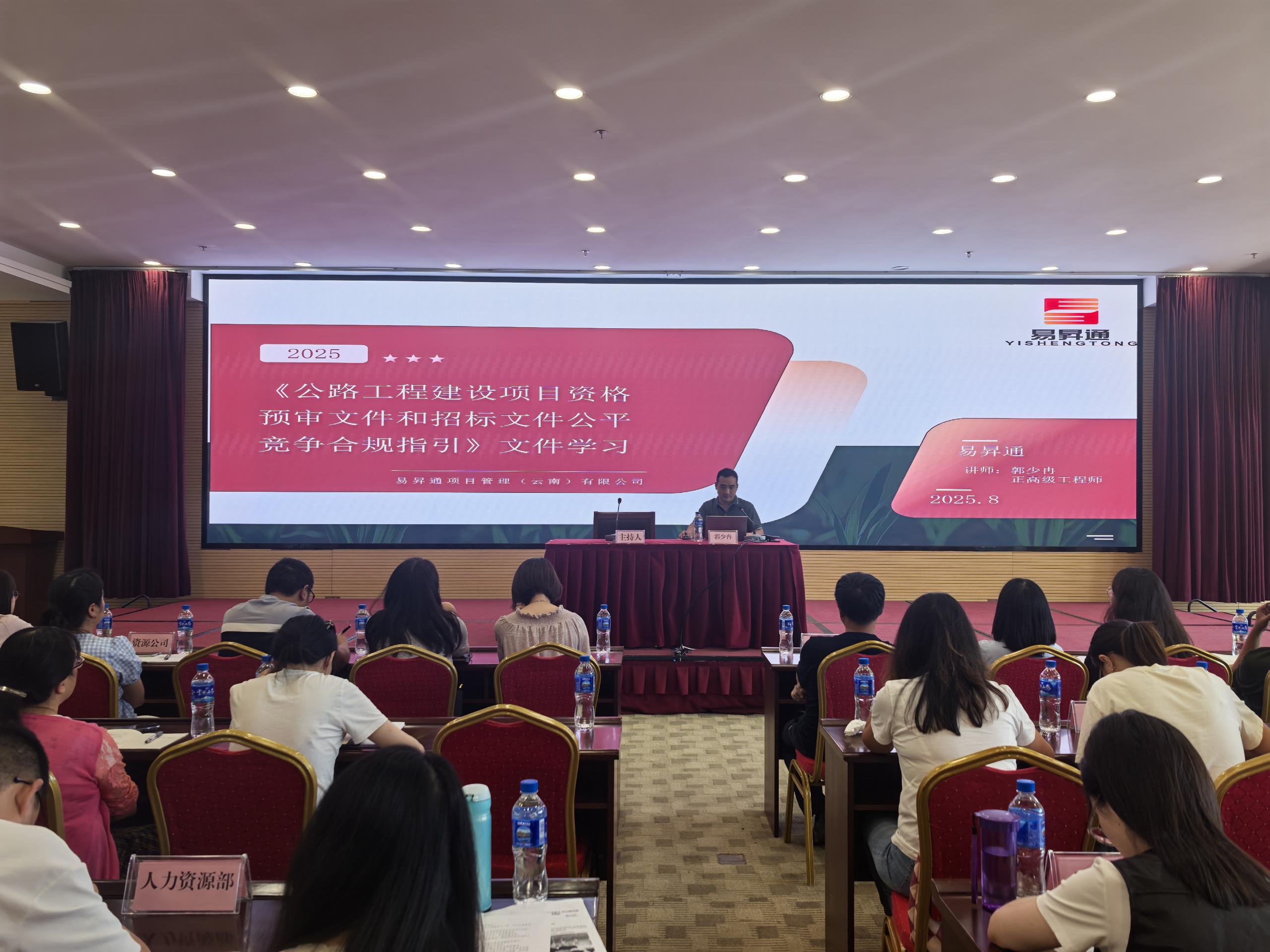 为全面提升公司公路工程建设项目招投标工作的规范化、专业化水平,切实保障公平竞争环境,2025年8月1日,公司特邀易昇通项目管理(云南)有限公司正高级工程师、公路领域资深招投标专家郭少冉,以《公路工程建设项目资格预审文件和招标文件公平竞争合规指引》(以下简称《指引》)为题开展培训。公司本部全体职工及下属公司招投标业务骨干参加了本次学习。