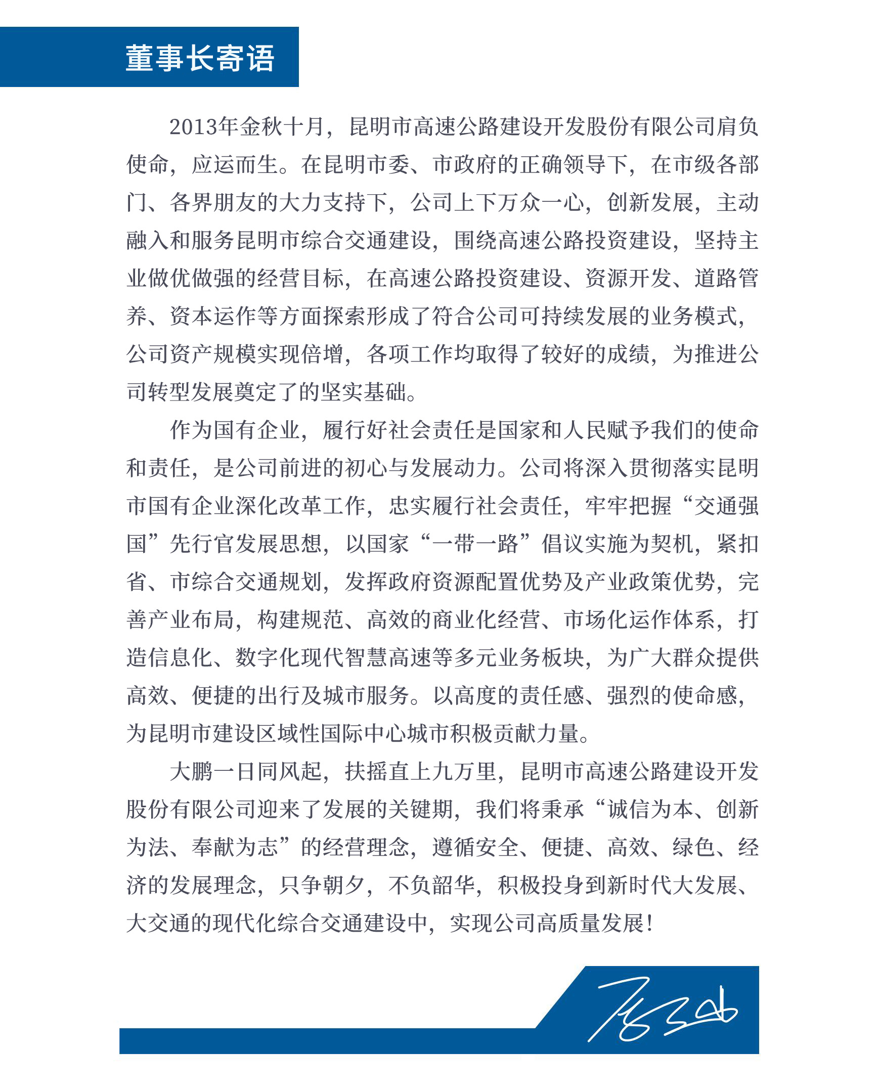 - 昆明市高速公路建设开发股份有限公司(以下简称“suncitygroup太阳官方网站”)系经昆明市国资委批准,于2013年10月18日组建,注册资本1.1364亿元,主体信用评级AA+,是...