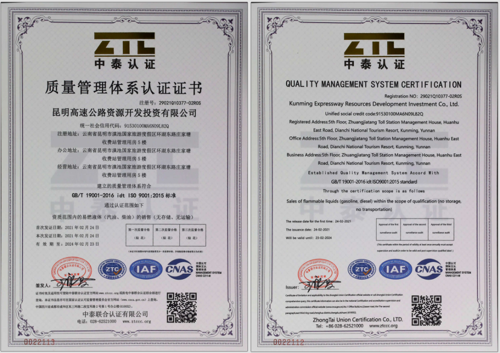 2021年3月9日,资源开发公司通过了中泰联合认证有限公司的监督审核,并取得了QES三体系(环境管理体系、质量管理体系、职业健康安全管理体系)认证证书。