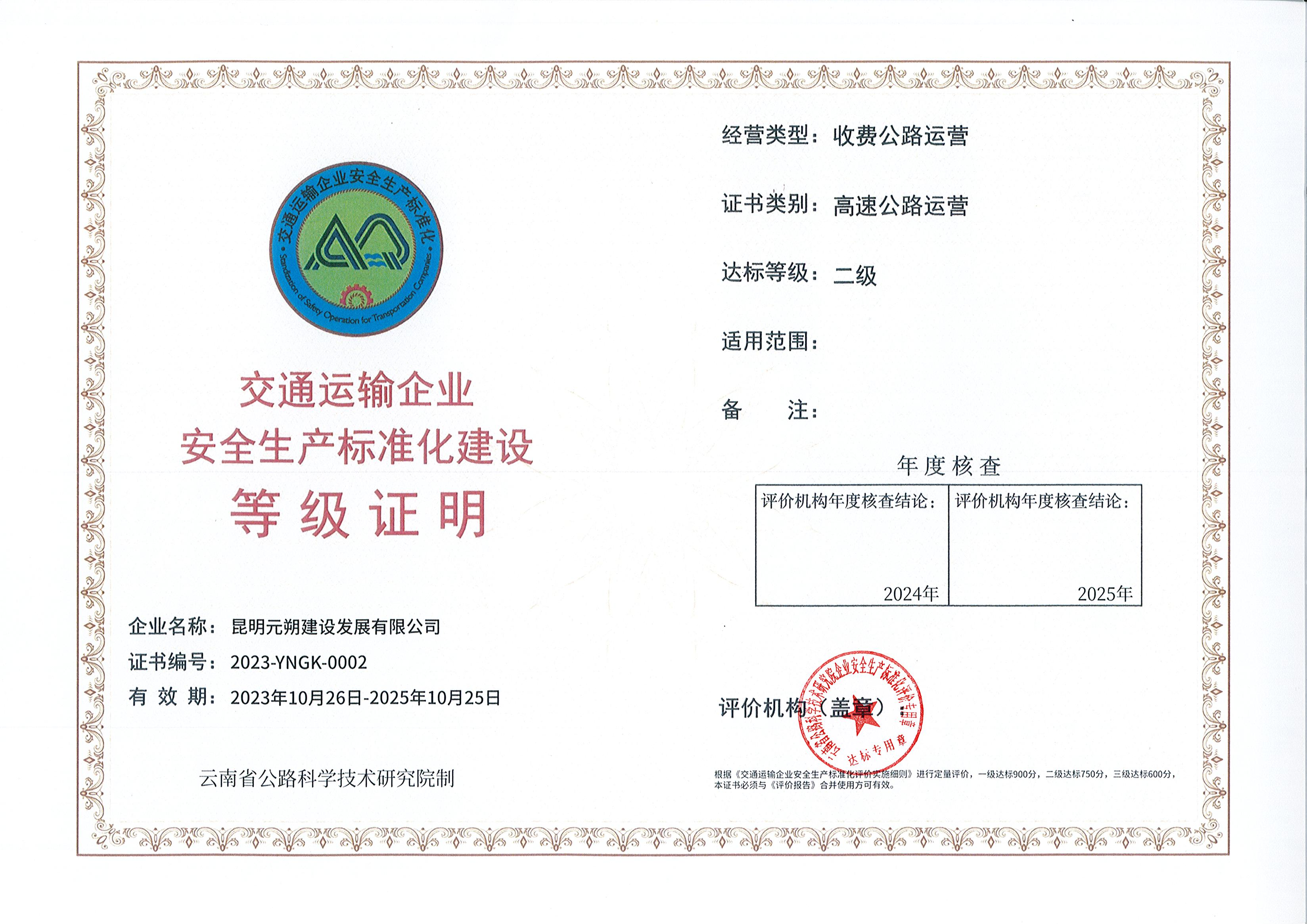 近日,suncitygroup太阳官方网站下属元朔公司顺利通过云南省公路科学技术研究院审核认证,取得“高速公路运营安全生产标准化二级”证书。